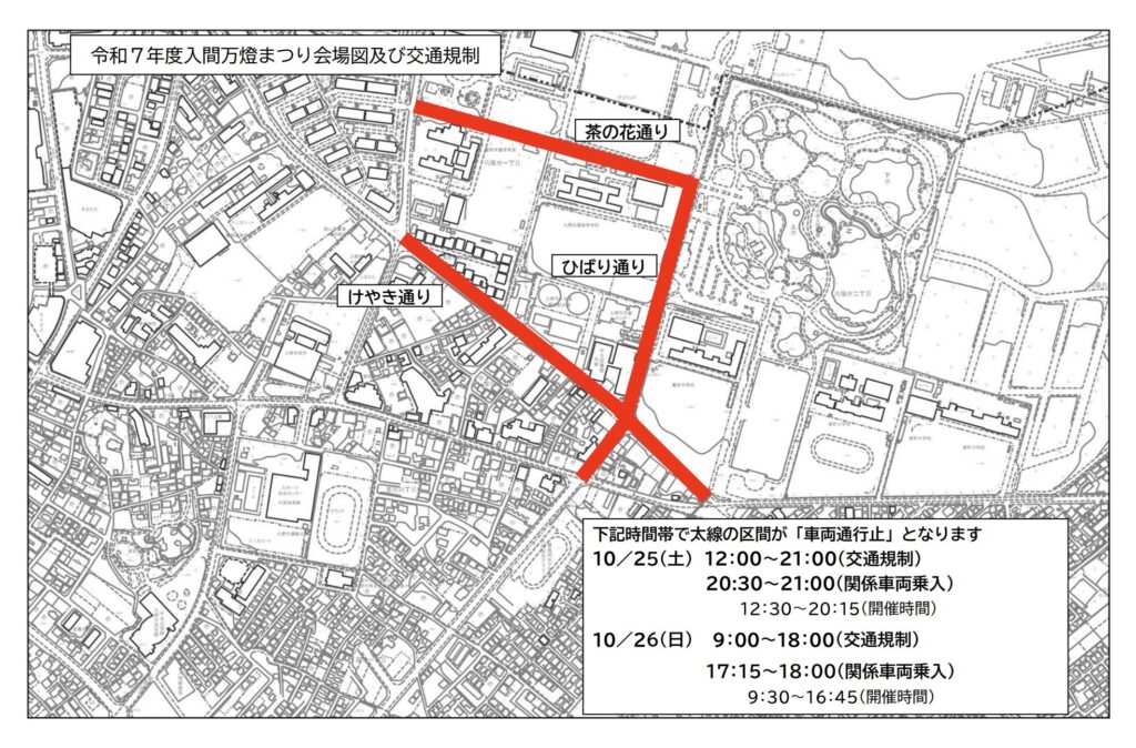 2025年の交通規制は、出店エリア(けやき通り・ひばり通り・茶の花通り)です。
