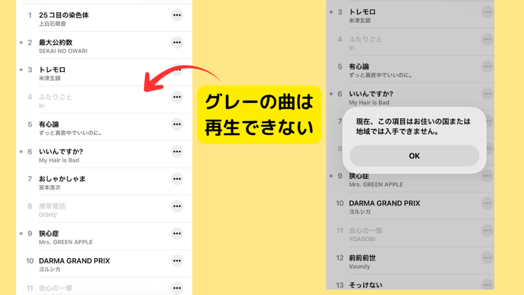 Apple Musicでは、アルバム側の配信設定や権利の都合により、一時的に一部の曲がグレー表示になって再生できない状態が発生することがあるようです。