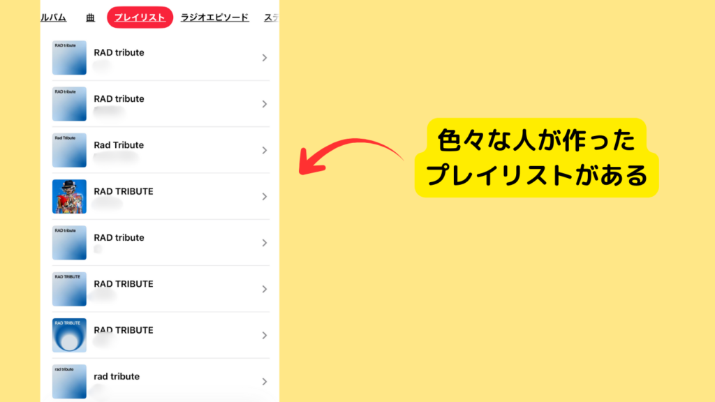 その場合、もう一度『Dear Jubilee』や『RADWIMPS Tribute』などでした後に、上部のタブから「プレイリスト」を選んでみましょう。