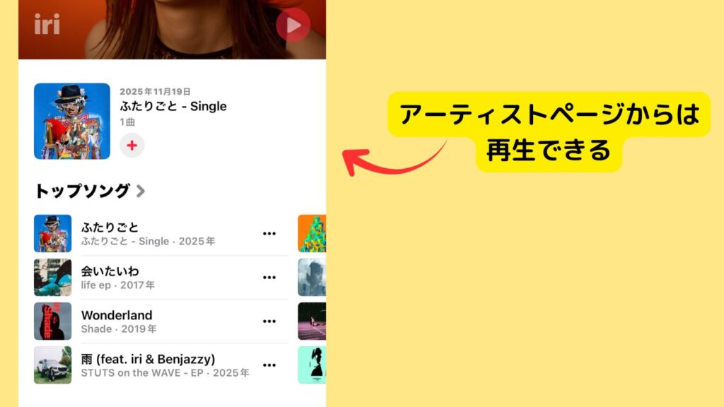 もう一つの方法として、アルバムではグレーになってしまっていて再生できなった曲のアーティストのページから検索する方法です。
