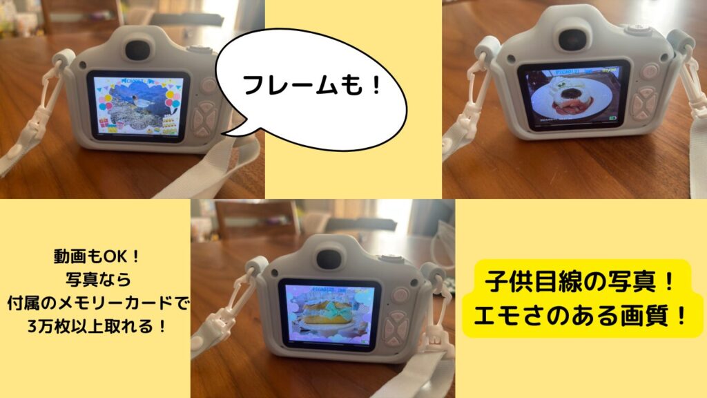 - 写真撮影:簡単に撮れるワンタッチ操作。画質もおもちゃながら十分に楽しめるクオリティ。
